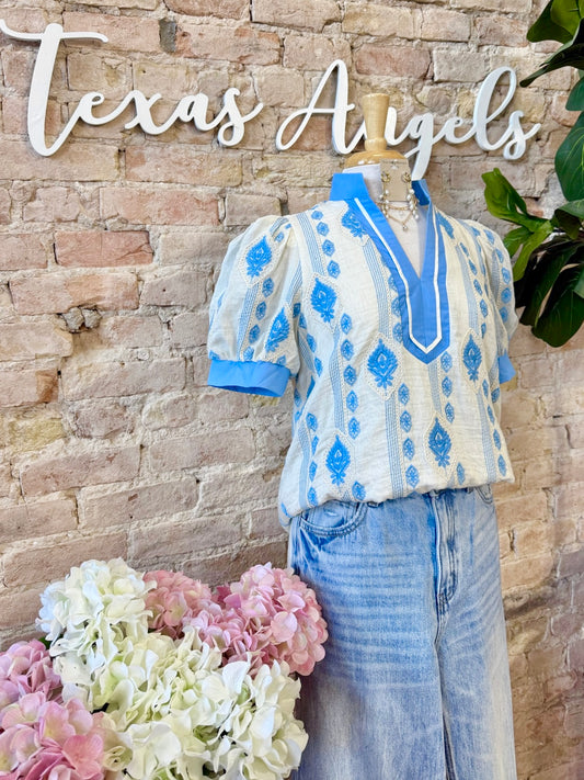 Boy Only If You Knew Blue Embroidered Blouse