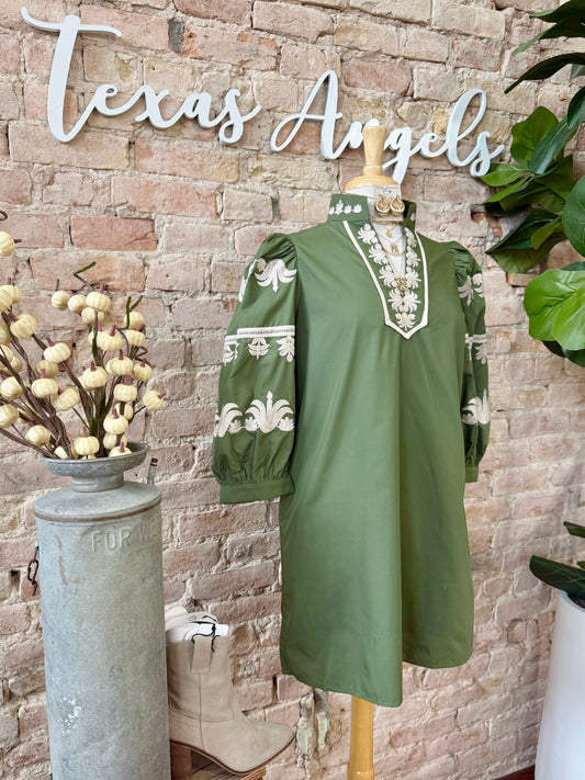 Only If You Promise Me Olive Embroidered Dress