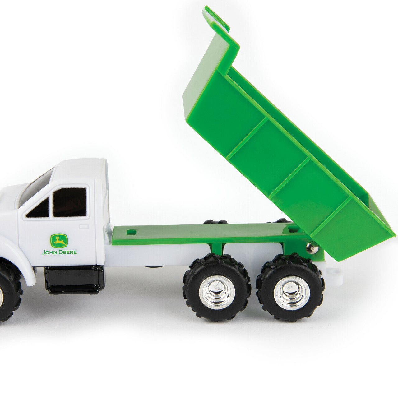 Interactive Vehicles: Both the truck and tractor have free-rolling wheels; the truck features a working dump bed and the tractor has a rear hitch for the wagon.